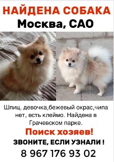 Шпиц, девочка. Чипа нет. Есть клеймо заводчика. Спокойная, добрая. Бегала без амуниции, придержали.